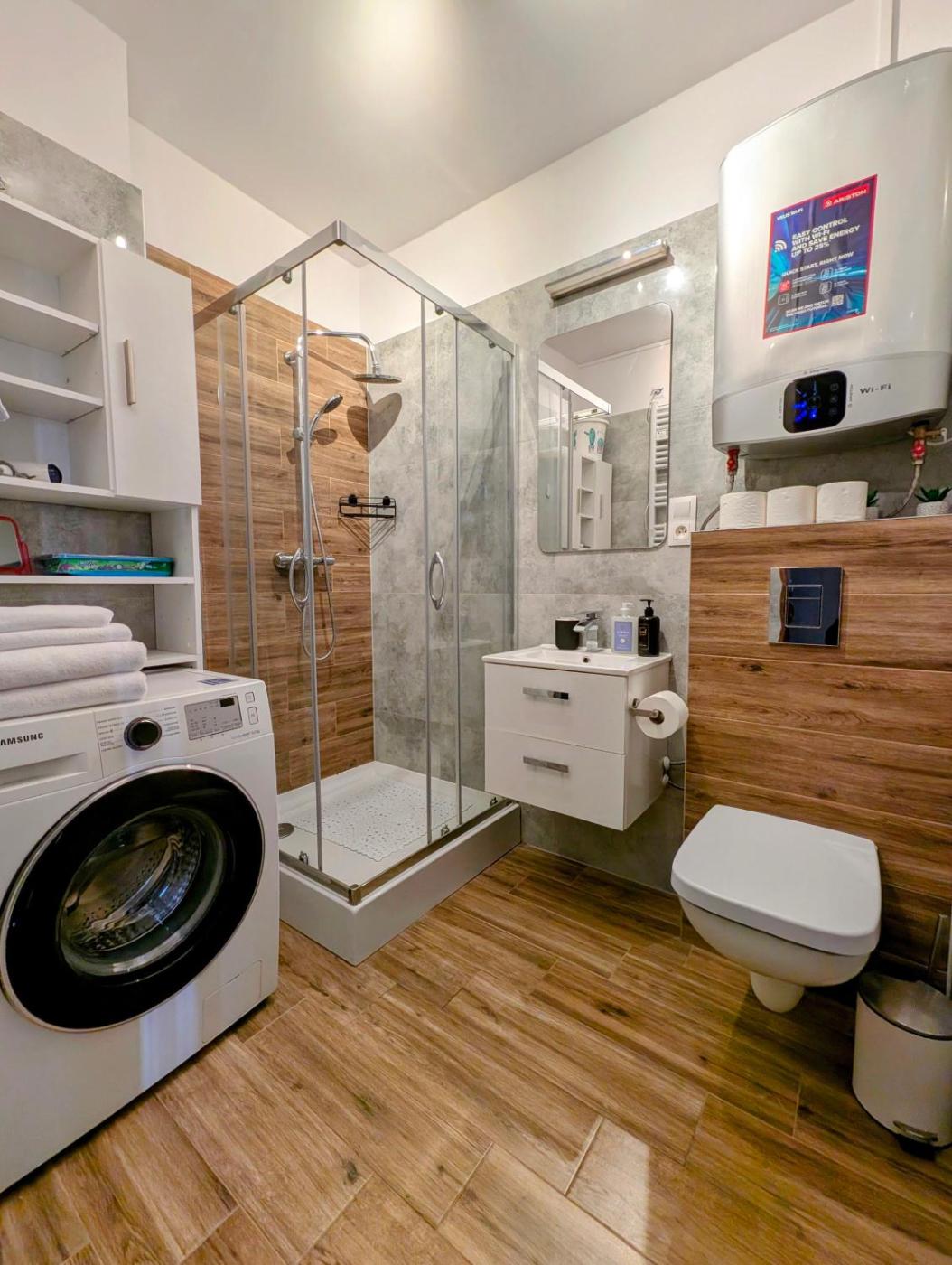 Studio. The well-equipped kitchen features a stovetop, a refrigerator, kitchenware and an oven. The studio offers air conditioning, a washing machine, as well as a private bathroom featuring a shower and a hairdryer. The unit offers 1 bed. Studio - 2 osobowy. Powierzchnia pokoju ok.: 25 mkw.